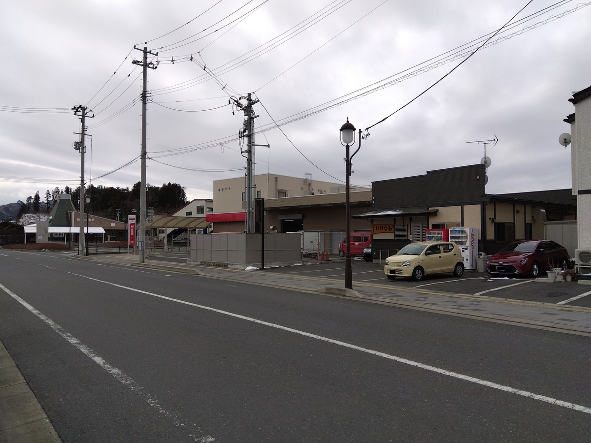 写真左から三陸鉄道陸中山田駅、郵便局、お食事処 たけなわの順で並んでいます。